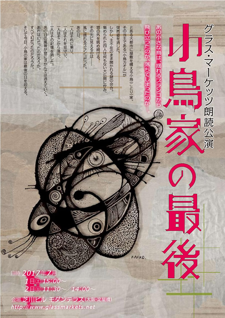 2017年 7月1日 (土) 15:00~ 7月2日(日) 11:30~/14:00~ *計3ステージ いずれも開場は30分前。 *上演時間 約70分 2,500円(一般) 1,500円(学生) *前売・当日共通、各回指定。(今回、特別に学生割引価格を設定しました。高校生以上は学生証の提示をお願いします。) 定員:各ステージ 50名 (*定員がございますので、お早目のご予約をお勧め致します) 芝川ビル4階 401号室 モダンテラス 大阪市中央区伏見町3-3-3 地下鉄御堂筋線「淀屋橋」駅13号出口より徒歩すぐ |